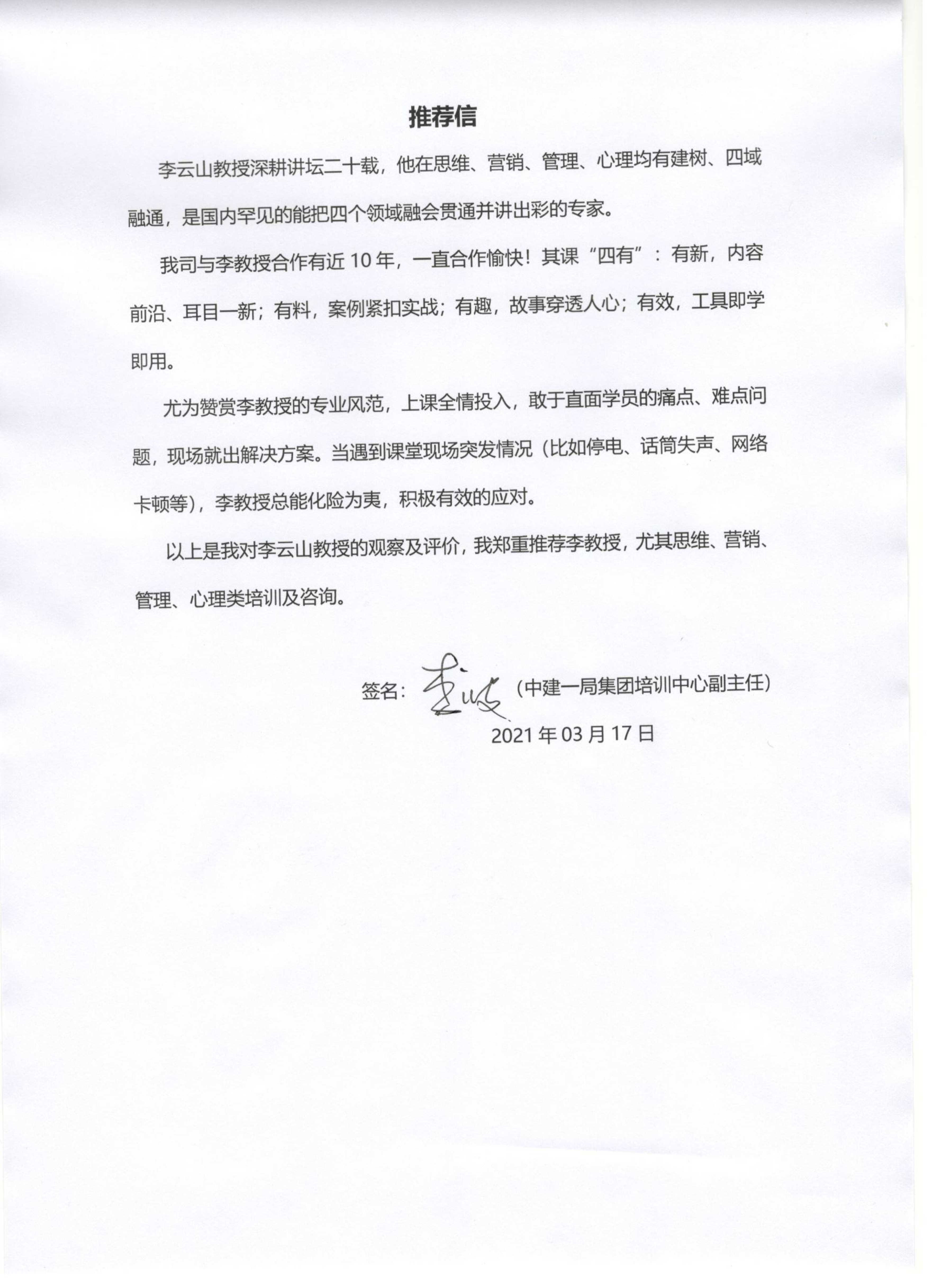 以上是我对李云山教授的观察及评价,我郑重推荐李教授,尤其思维、营销、管理、心理类培训及咨询。