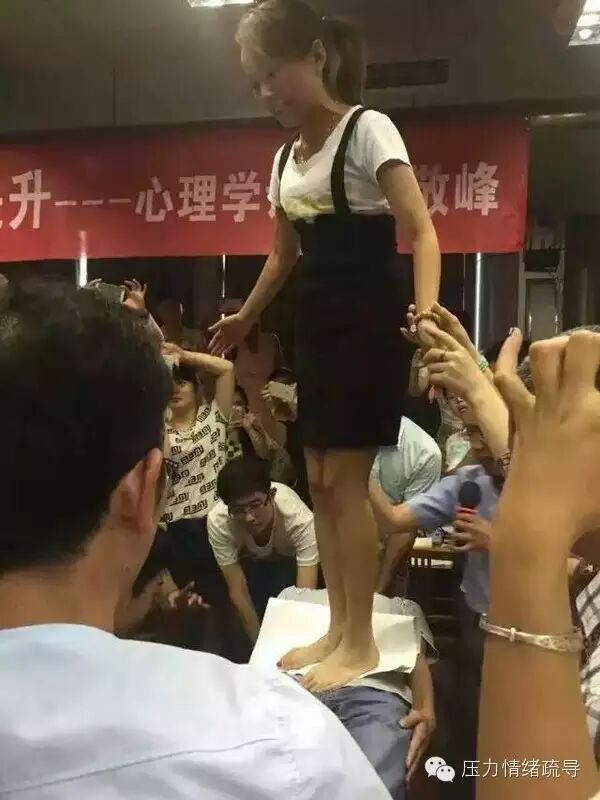 在大家的热烈期待中,郭老师展示了神奇催眠术-架人桥,一位帅哥在众目睽睽下被催眠想象成一颗苍天大树,笔直站立,并被抬到两个高立的椅背上,腰部完全悬空后依然如“钢板”般笔直,这时站上去一位美女,进入催眠状态的帅哥却浑然不觉当他被唤醒后,回忆好像不记得发生了什么,只知道自己就是一颗挺立的大树。。。现场响起了热烈的掌声!
